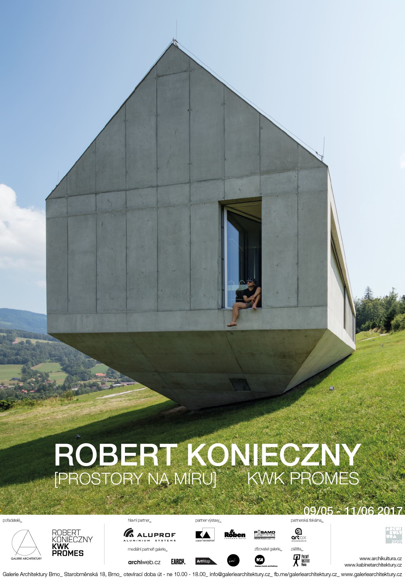 Robert Konieczny přijede osobně zahájit světovou premiéru retrospektivní výstavy svých prací do brněnské Galerie architektury. Návštěvníci na velkoformátových fotografiích, plánech, modelech, videích a osobní zpovědi architekta poprvé spatří téměř dvacetiletou práci jeho ateliéru KWK PROMES. Výstava je součástí festivalu Archikultura 2017 a připravila ji Galerie Architektury Brno za podpory ostravského Kabinetu architektury. Po její brněnské premiéře výstava poputuje do dalších českých a evropských galerií.