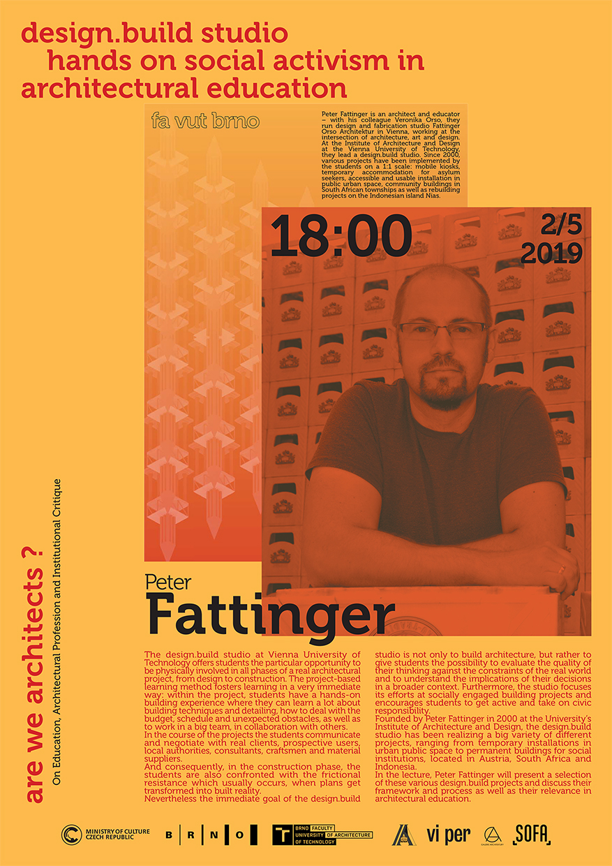 Galerie Architektury Brno ve spolupráci s Fakultou architektury Vysokého učení technického v Brně a Studentskou obcí Fakulty architektury uspořádala přednášku architekta a pedagoga Peter Fattinger „design.build studio praktický sociální aktivismus v architektonickém vzdělávání“, která byla součástí přednáškové série „Jsme architekti? O vzdělávání, architektonické profesi a institucionální kritice“.Akce proběhla ve čtvrtek 2. května 2019 v 18:00 v přednáškové místnosti A310 na Fakultě architektury, Poříčí 5, Brno. Přednáška byla v angličtině. Informace o přednášcezde na webu fakulty.Informace o sérii níže.