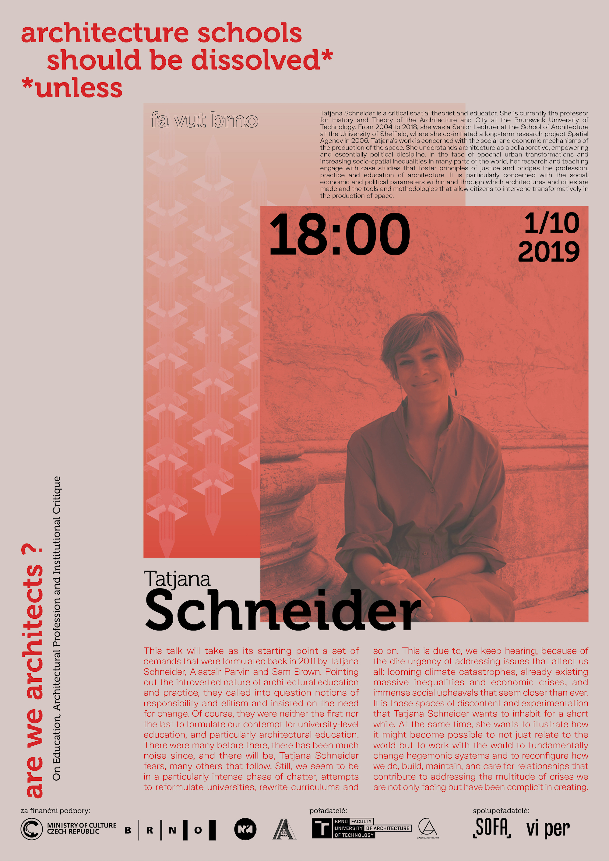 Galerie Architektury Brno ve spolupráci s Fakultou architektury Vysokého učení technického v Brně a Studentskou obcí Fakulty architektury uspořádala přednášku urbánní teoretičky a pedagožky Tatjana Schneider „Školy architektury by měly být zrušeny!* *ledaže“, která byla součástí přednáškové série „Jsme architekti? O vzdělávání, architektonické profesi a institucionální kritice“.Akce proběhla v úterý 1. října v 18:00 v přednáškové místnosti A310 na Fakultě architektury, Poříčí 5, Brno. Přednáška byla v angličtině. Informace o přednášcezde na webu fakulty.Informace o sérii níže.