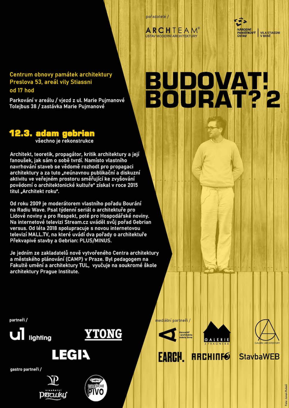 Architekt a teoretik Adam Gebrian (*1979, Boskovice, CZ) se namísto vlastního navrhování staveb rozhodl pro propagaci architektury. Za tuto publikační a diskuzní aktivitu směřující ke zvyšování povědomí o architektonické kultuře získal v roce 2015 titul „Architekt roku“.