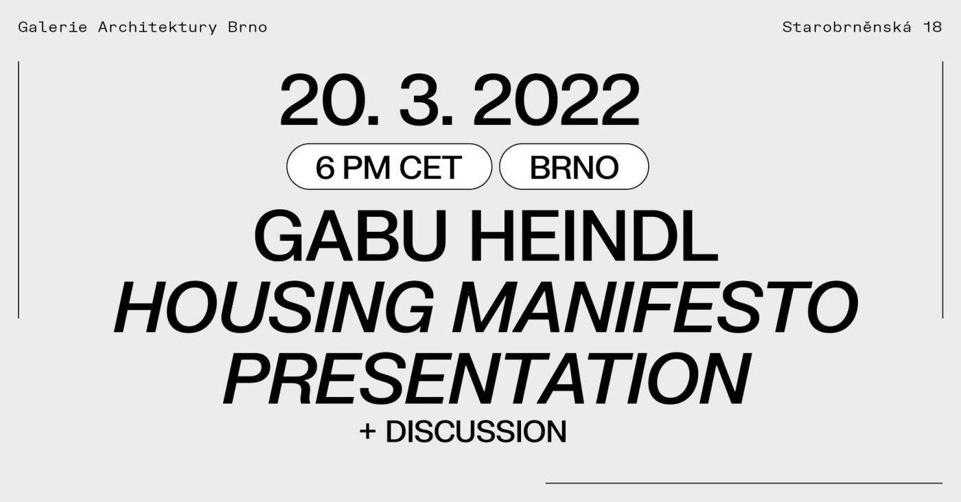 The Brno Gallery of Architecture and the Faculty of Architecture at BUT cordially invite you to the finissage of the exhibition Gabu Heindl: Urban Conflicts – A Housing Manifesto, part of it will be the presentation of the manifesto followed by a discussion with Czech guests who will relate it to the housing crisis in Brno and in the Czech Republic. The event will take place on Sunday 20 March at 18:00 CET at the Brno Gallery of Architecture, in English.