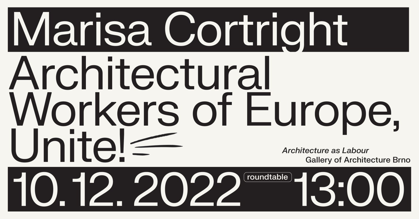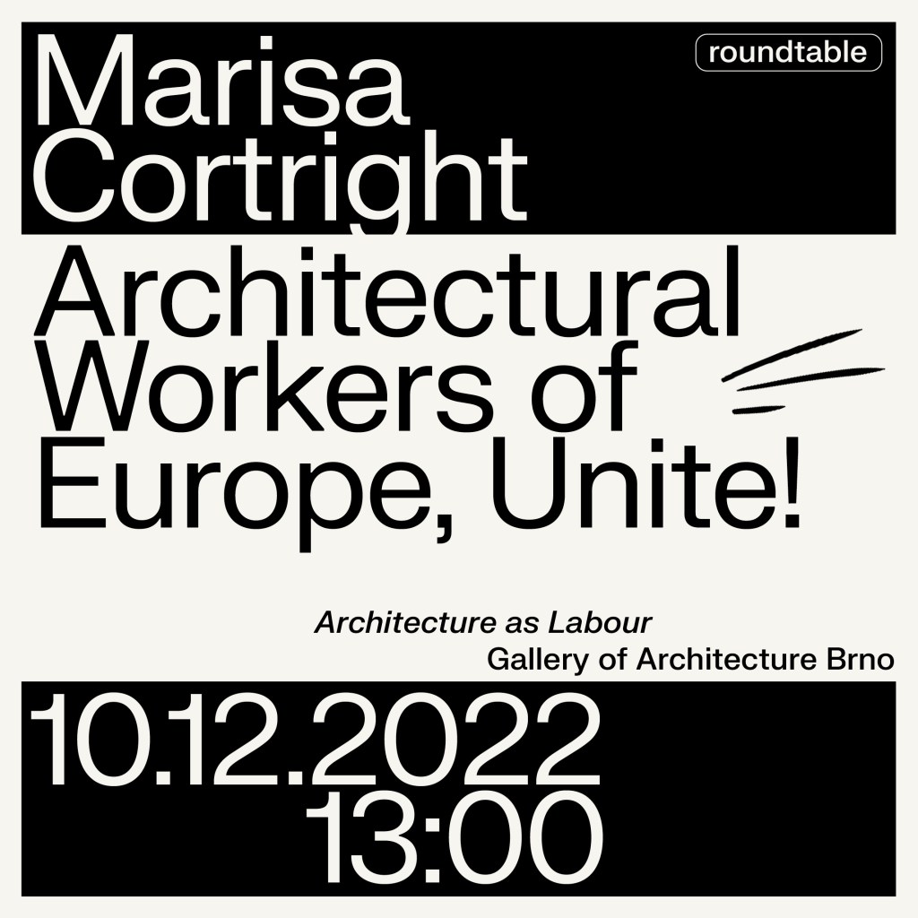 Prostor pro angažovanou architekturu, pod Fakultou architektury VUT v Brně, zve na kulatý stůl s pracantkou v architektuře Marisou Cortright. Marisa dlouhodobě mapuje pozici pracujících v architektuře v Evropě a jejich organizace, své poznatky shrnula například v publikaci „Can this be? Surely this cannot be?“ Architectural Workers Organizing in Europe [„Je to možné? To snad není možné?“ Organizování pracujících v architektuře v Evropě], vydané pražskou galerií VI PER v roce 2021. Akce se uskuteční v anglickém jazyce v sobotu 10. 12. 2022 od 13:00 v Galerii Architektury Brno, v rámci doprovodného programu výstavy Drazí architekti… — Architektura jako práce.