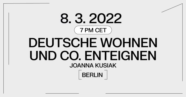 Galerie Architektury Brno a Fakulta architektury VUT v Brně zvou na online přednášku urbanistky Joanny Kusiak o berlínské iniciativě „Vyvlastnit Deutsche Wohnen“. S rakouskou architektkou Gabu Heindl budou diskutovat financializaci bydlení, regulaci nájemného a organizaci nájemníků a deprivatizace bydlení. Diskuse je doprovodným programem k aktuální výstavě Gabu Heindl: Městské konflikty – Manifest bydlení. Akce se uskuteční v úterý 8. března 2022 v 19:00 online, v angličtině.